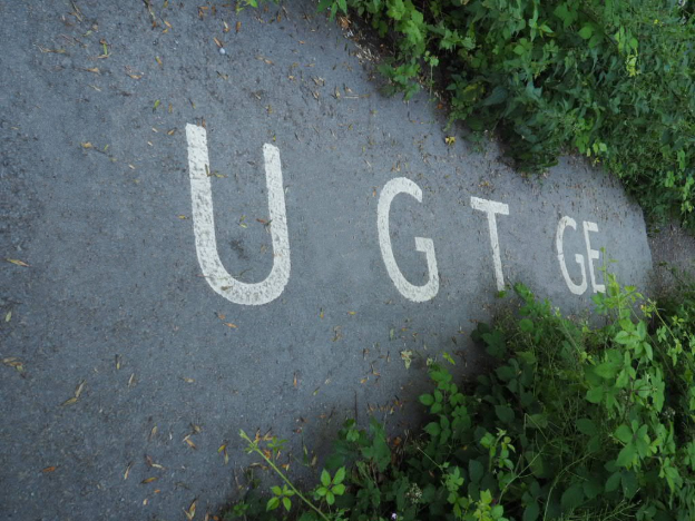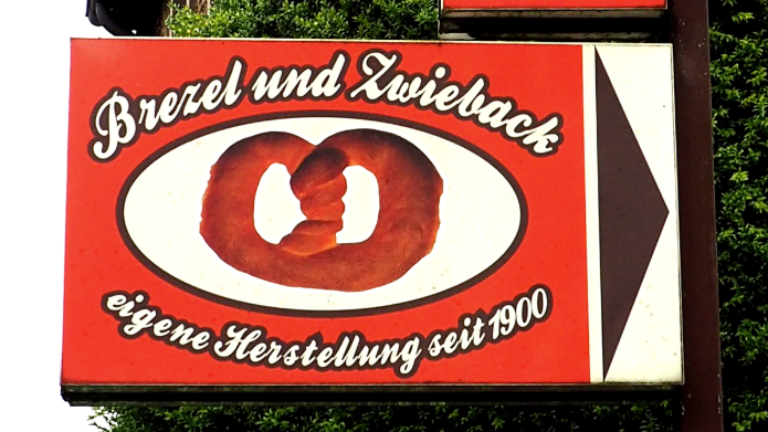 Geht vom Wanderparkplatz aus zur Straße, biegt rechts ab und folgt dem Straßenverlauf den Berg hinunter. Bleibt auf dieser Straßenseite. Nutzt das Bild, um das Schild mit der Brezel der Bäckerei genau zu studieren. Sucht nach den Buchstaben, die zwei Mal vorkommen. Derjenige, der der Mitte des Alphabets am nächsten liegt, ist der Schlüssel zum nächsten Rätsel.