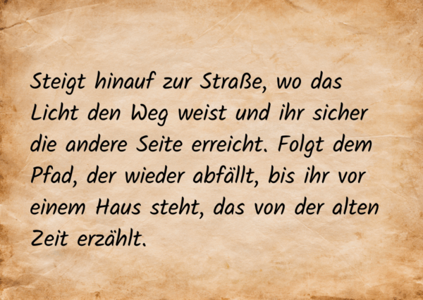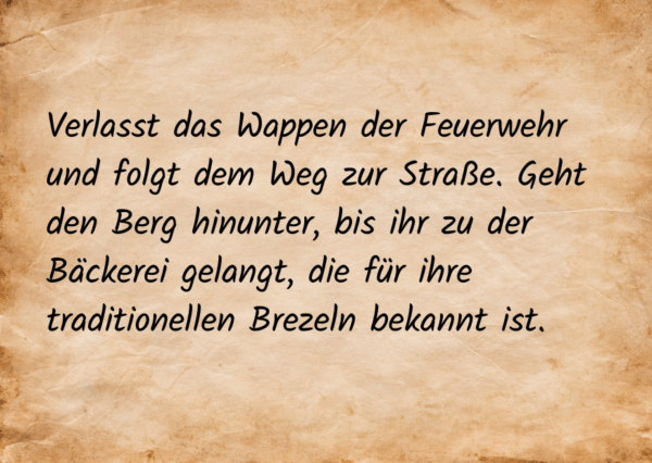 Glückwunsch, ihr habt den ersten Hinweis entschlüsselt! Die Anweisungen von Graf Engelbert in seinem Brief haben euch eine Wegbeschreibung enthüllt, die ihr nun verfolgen müsst: